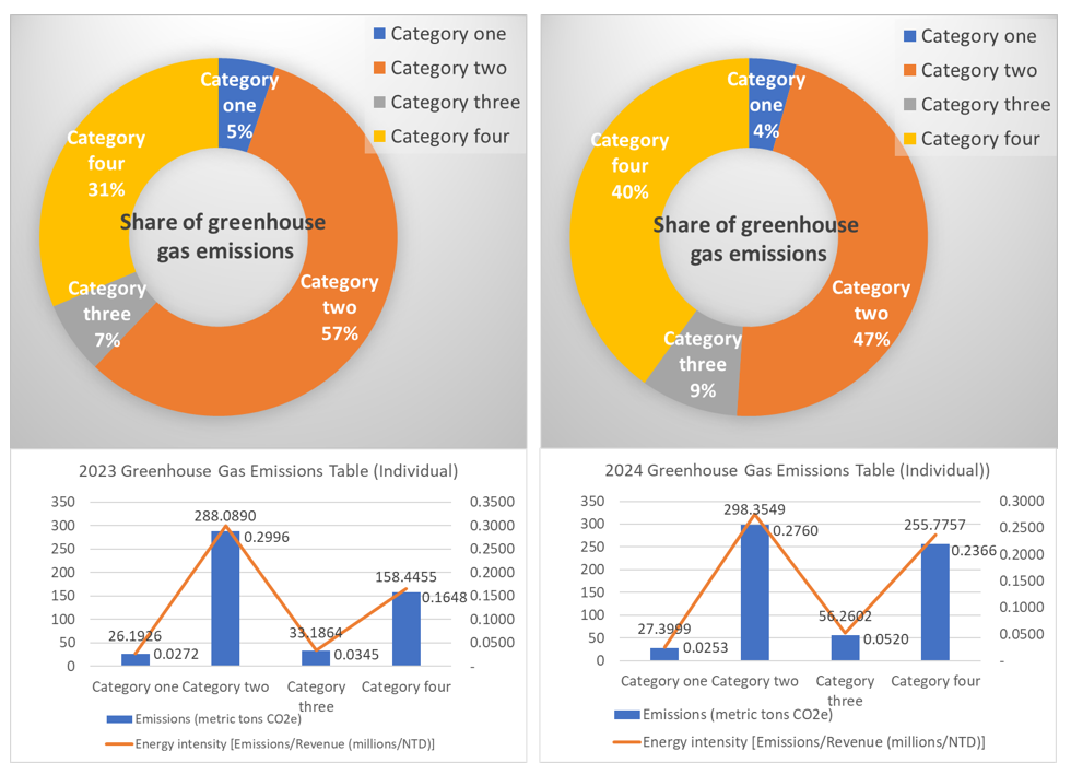 To manage energy consumption across inergy Technology’s upstream and downstream value chain, we began identifying significant external operational activities in 2024. This assessment was based on four key dimensions: external disclosure requirements, quantitative methodology, accessibility of emission factors, and the company's degree of control. > In 2024, our energy intensity—covering purchased goods and services, capital goods, fuel- and energy-related activities, upstream transportation and distribution, waste generated in operations, business travel, and employee commuting—was 0.3058 (tCO2e / per million TWD revenue). Among these, Category 4 (Purchased Goods and Services) accounted for the largest share, representing 38.2% of our total value chain energy consumption, with other categories making up the remaining 11.8%. Consequently, our future energy-saving initiatives will focus on collaborating with upstream suppliers to replace aging fuel-based transport equipment with electric vehicles (EVs) and renewable energy solutions.
