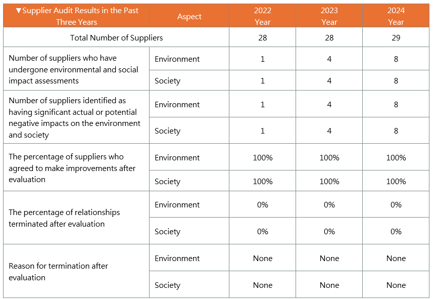 While there were previously no specific mandates requiring suppliers to follow protocols regarding environmental protection, occupational safety and health, or labor human rights, the company reserves the right to terminate or dissolve partnerships depending on the severity of any significant negative impacts a supplier may have on the environment or society. To uphold integrity and prevent illegal business practices, we have planned to require all suppliers to adhere to the "Human Rights and Environmental Sustainability Commitment" and the "Supplier Code of Conduct" starting in 2024. These requirements are rooted in the company's professional ethics and integrity standards, aiming to create a healthy and safe working environment, protect employee rights, promote environmental conservation, and prevent corruption. To ensure sustainable and honest business collaborations, we strictly implement supplier sustainability management through our "Outsourcer Management Procedures" and "Environmental Substance Management Procedures," requiring all suppliers to comply with these regulations.