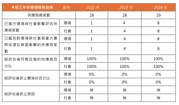雖尚無特別訂定要求供應商在環保、職業安全衛生或勞動人權等議題遵循相關規範,但供應商對環境與社會有顯著影響時,本公司將視情事嚴重程度終止或解除合作關係。為落實誠信經營並嚴防非法商業行為發生,研擬自2024年起要求供應商遵循《人權暨環境永續承諾書》及《供應商行為準則》,以本公司的從業道德與誠信規範作為依據,打造健康安全的工作環境、保障員工權益、促進環境保護與防止貪瀆。為確保誠信永續之商業合作,我們確實執行供應商永續管理,訂有《外包商管理程序》、《環境物質管理程序》,並規範供應商須遵守相關規定。