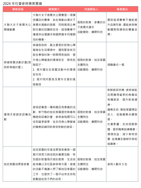 廣閎科技秉持著 「取之於社會,用之於社會」理念,在追求公司營運成長的同時,不忘對社會貢獻一份心力,秉持著尊重生命、關懷弱勢的精神,散播愛的種子來回饋社會,透過捐款及資源的傳遞,表達對弱勢者之關懷;亦投入資源降低環境衝擊、宣導環保意識,以善盡環境責任。不定期參與社會服務工作,提升社會參與、貢獻與服務,積極對外參與社會急難救助及社會回饋。